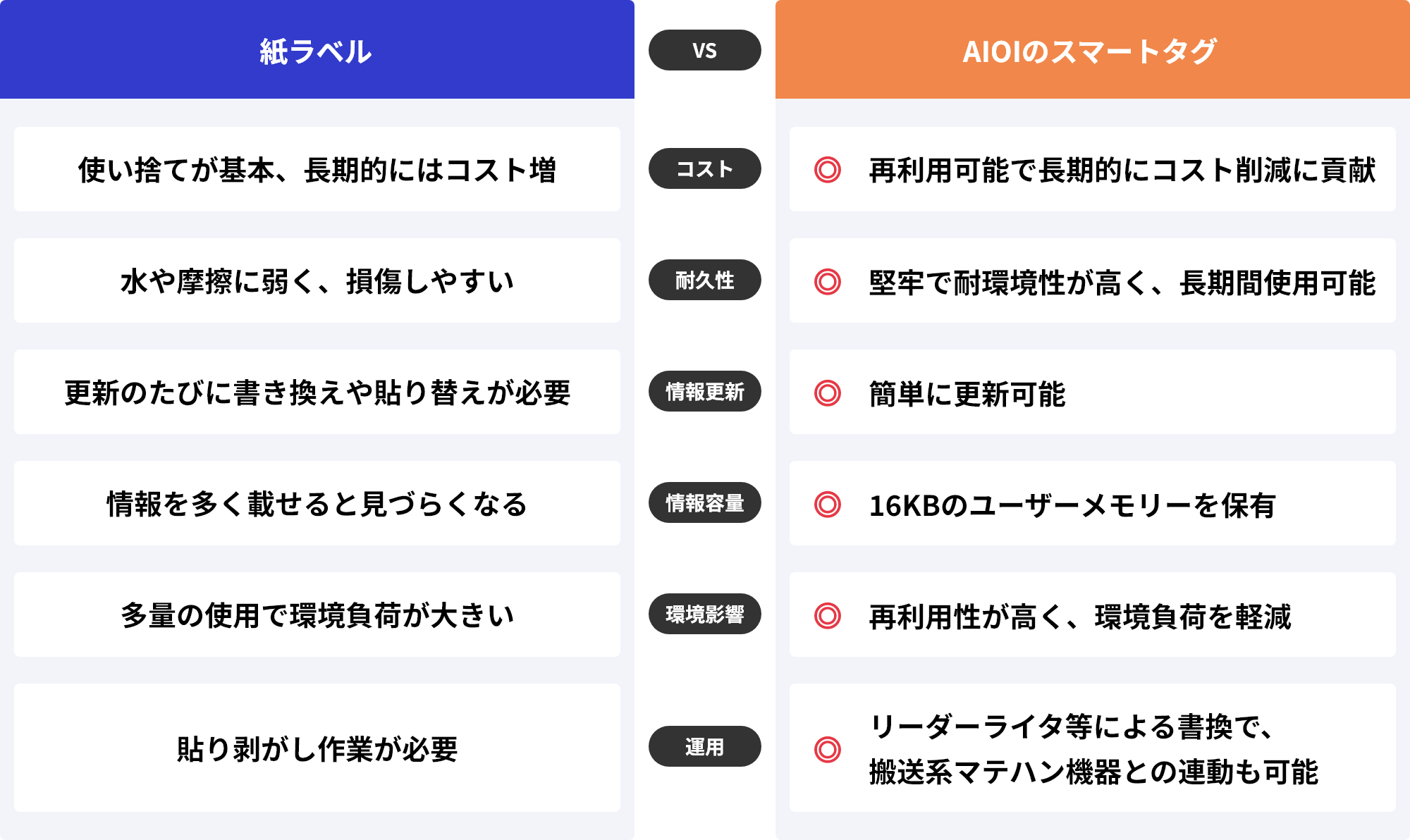アイオイのSmart Tagは、紙ラベルの廃止と紙ゴミ排出ゼロを実現し、ラベルの貼り剥がし作業が不要で防塵防水で繰り返し使用できます。さらに、電池不要で100万回以上の書換が可能です。